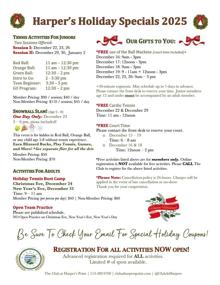 Happy Harper’s Holidays! Holiday Clinics, Specials, and More…Check It Out!