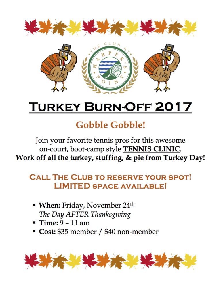 Gobble Gobble! Hit the courts the day after Thanksgiving and work off all of those turkey day favorites. Reserve your spot now – space is limited and this awesome tennis boot camp is sure to fill up!